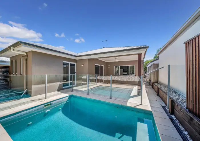 Located at the end of a quiet Cal de sac this modern home is complete with additional off street parking, 9ft ceilings, air conditioning, ceiling Fans throughout, swimming pool and more.