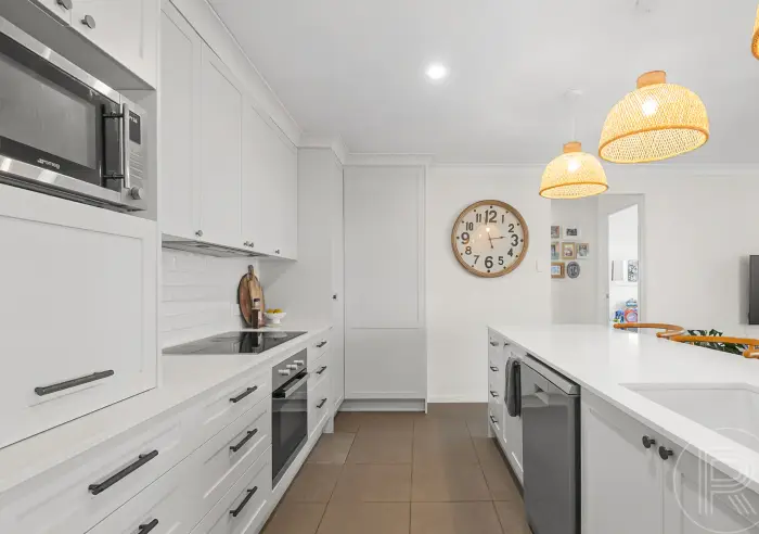 At the heart of the residence, the well-appointed and updated kitchen is both functional and well-positioned, complete with an induction cooktop, dishwasher, large pantry, and breakfast bar seating. Overlooking the main living and dining zone, it ensures connection remains at the forefront of the home's design.