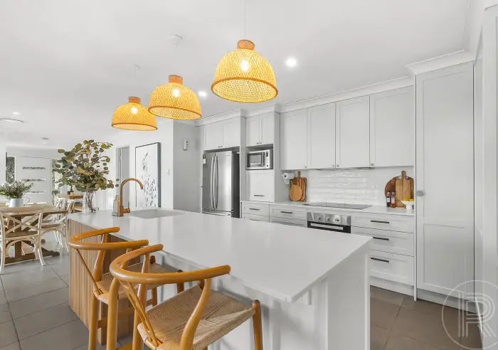 A charming entrance with solid timber uprights creates an inviting first impression, leading into a thoughtfully designed floorplan that balances comfort and functionality. Neutral modern tones throughout enhance the sense of space, while ducted air-conditioning and the practical open-plan layout form the central hub of the home for everyday family living.