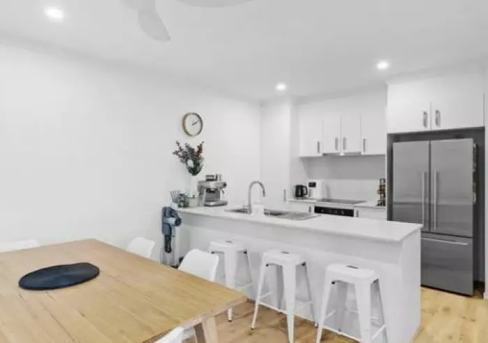 Floating wood floors lead from the entry to the open plan living/dining area which features clean white walls and split system air conditioning for year round comfort. The all white kitchen adds to the fresh appeal of the home and boasts ample storage, electric cook top and a double fridge space.