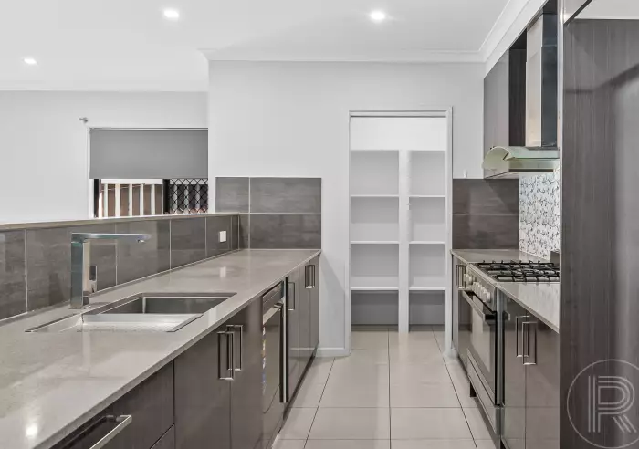 -Modern kitchen with stainless steel appliances & stone benchtops