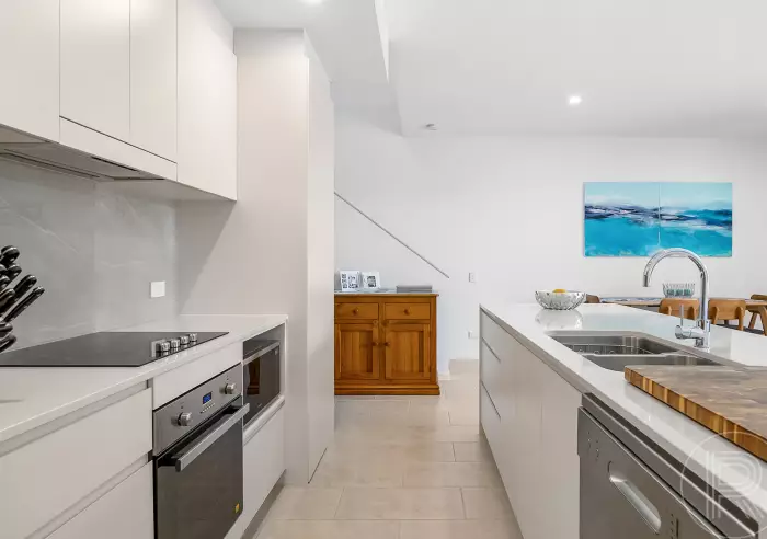 Gourmet Kitchen: Equipped with stainless steel appliances, induction cooktop, and ample bench space.