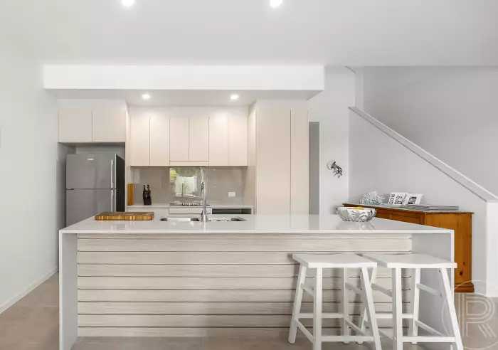 The heart of the home is the expansive open-plan living, dining, and kitchen area. Designed for seamless flow and effortless entertaining, this bright space spills out onto a private, north facing easy-maintenance courtyard, the perfect spot to unwind and soak up the glorious afternoon sun. Meal preparation will be an absolute pleasure in the gourmet kitchen, featuring sleek stainless steel appliances, a modern induction cooktop, and abundant stone bench space for the aspiring home chef.