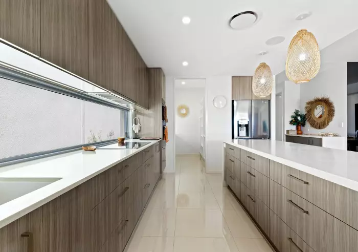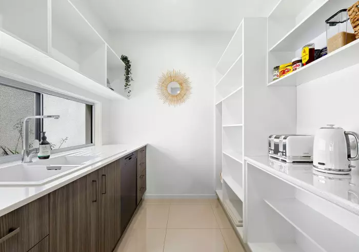 - Superb kitchen with stone bench tops, striking white sinks, stainless steel Miele appliances, soft closing drawers, in-sinkerator, plumbed double fridge space, large butlers pantry